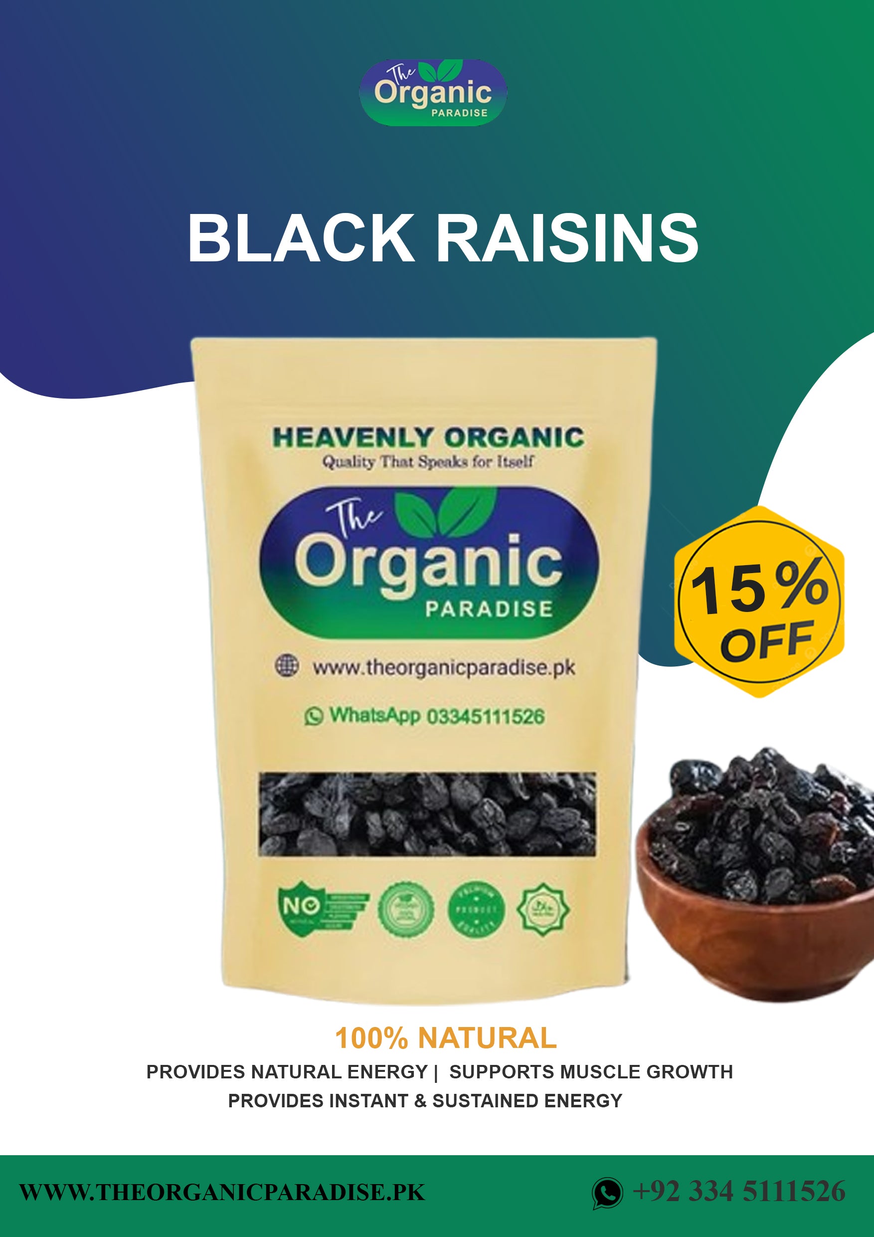 دی اورگینک پیراڈائز آپ کے لیے 100% خالص، اورگینک اور غذائیت سے بھرپور کالے کشمش لایا ہے، جو آئرن، فائبر، اینٹی آکسیڈنٹس، اور ضروری وٹامنز سے بھرے ہوتے ہیں۔ یہ قدرتی مٹھاس سے بھرپور کشمش توانائی بڑھانے، ہاضمے کو بہتر بنانے، اور دل کی صحت کے لیے بہترین ہے۔ ہمارا وعدہ آپ کی صحت کا خیال رکھنا ہے!