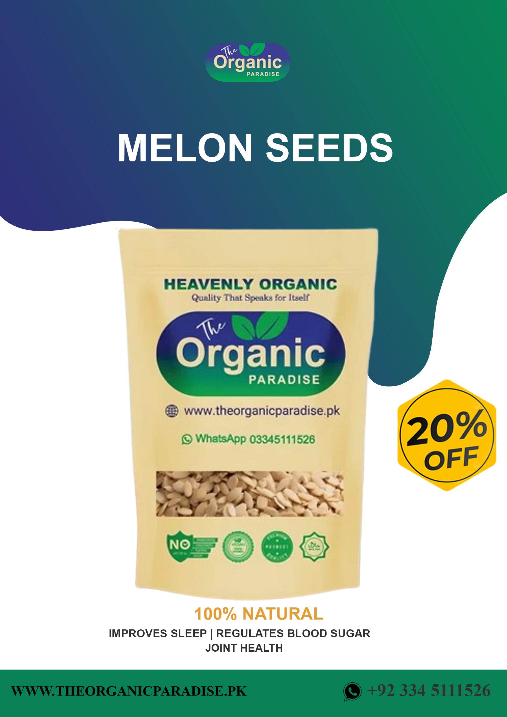 دی اورگینک پیراڈائز آپ کے لیے 100% خالص، اورگینک اور غذائیت سے بھرپور تربوز کے بیج لایا ہے، جو پروٹین، فائبر، صحت مند چکنائی، وٹامنز اور ضروری معدنیات سے بھرے ہوتے ہیں۔ یہ چھوٹے مگر طاقتور بیج دل کی صحت، بہتر ہاضمے، جلد اور مجموعی صحت کے لیے بہترین ہیں۔ ہمارا وعدہ آپ کی صحت کا خیال رکھنا ہے!