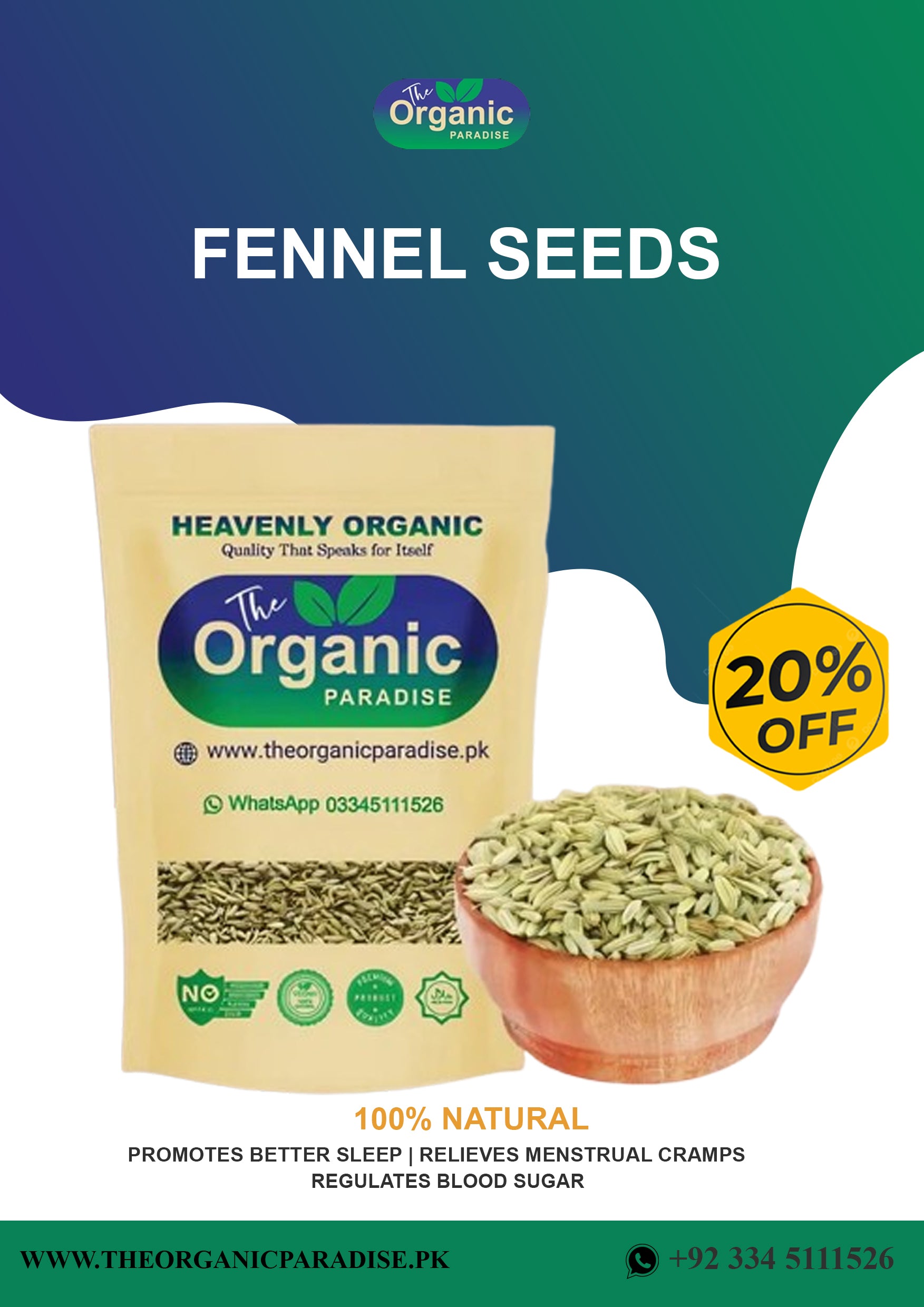 At The Organic Paradise, we bring you 100% pure, organic, and hygienic fennel seeds, packed with essential vitamins, fiber, antioxidants, and digestive enzymes. These fragrant seeds are renowned for their digestive, anti-inflammatory, and metabolism-boosting properties. We promise what we sell, ensuring you get fresh, premium-quality fennel seeds because your health is our priority!