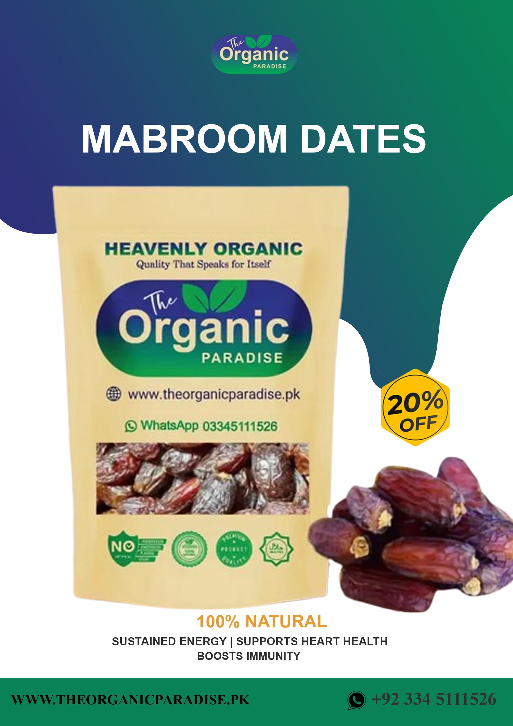 دی اورگینک پیراڈائز آپ کے لیے 100% خالص، اورگینک اور حفظان صحت کے اصولوں کے مطابق تیار شدہ مبروم کھجور لایا ہے، جو قدرتی غذائیت اور بے شمار فوائد سے بھرپور ہے۔ ہمارا وعدہ آپ کی صحت کا خیال رکھنا ہے!