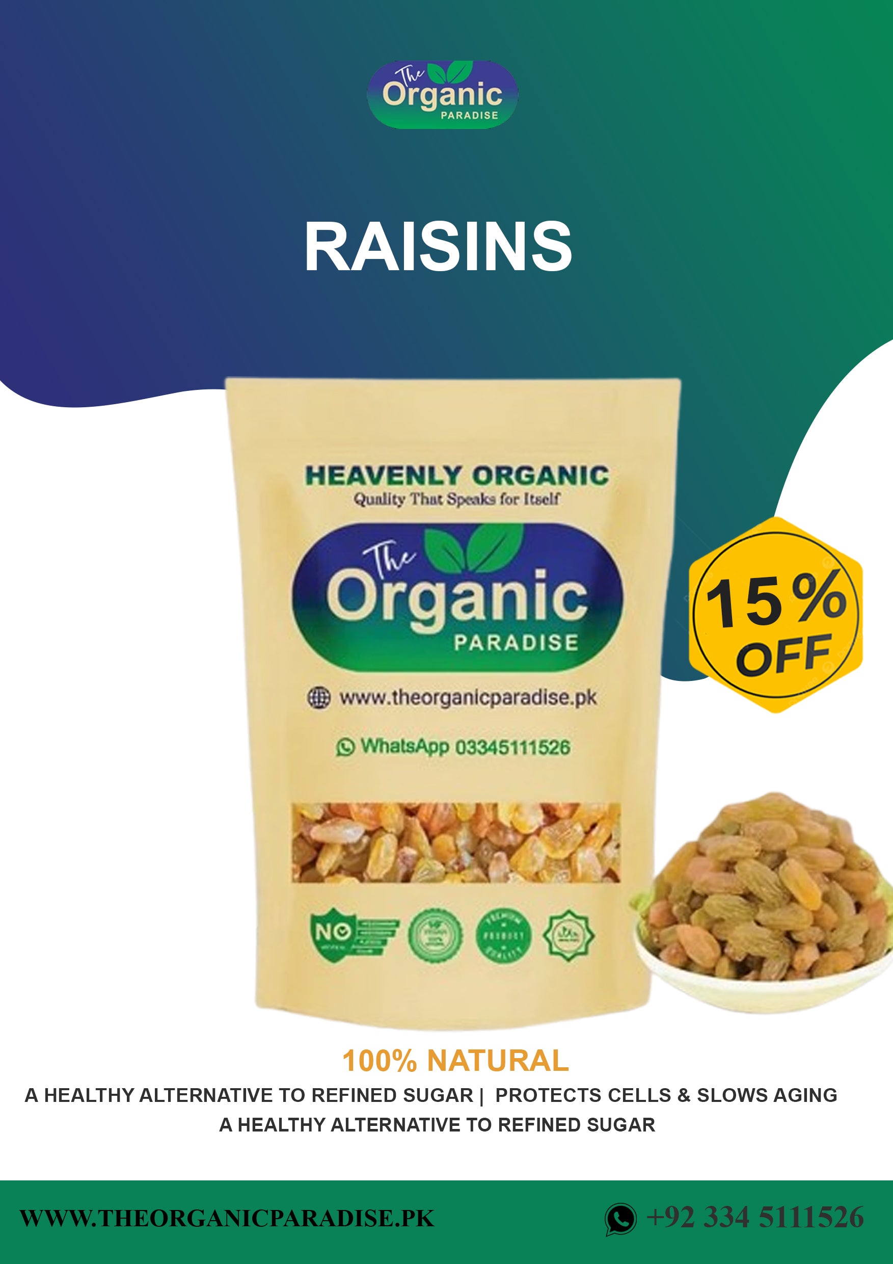 دی اورگینک پیراڈائز آپ کے لیے 100% خالص، اورگینک، اور غذائیت سے بھرپور سبز کشمش لے کر آیا ہے، جو فائبر، وٹامنز، اینٹی آکسیڈنٹس، اور ضروری معدنیات سے بھرپور ہے۔ یہ مزیدار اور میٹھی کشمش فوری توانائی، بہتر ہاضمہ، دل کی صحت، اور خوبصورت جلد کے لیے بے حد مفید ہے!